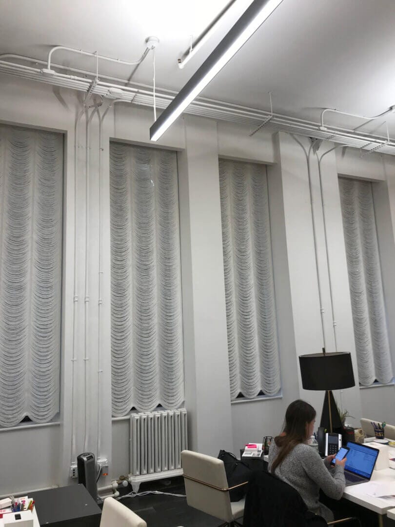 Our String Roman Shades are free falling window coverings with strings that are woven every 2’-3” on the solid weave across (horizontal weft) and are spaced apart approximately every 10”.
