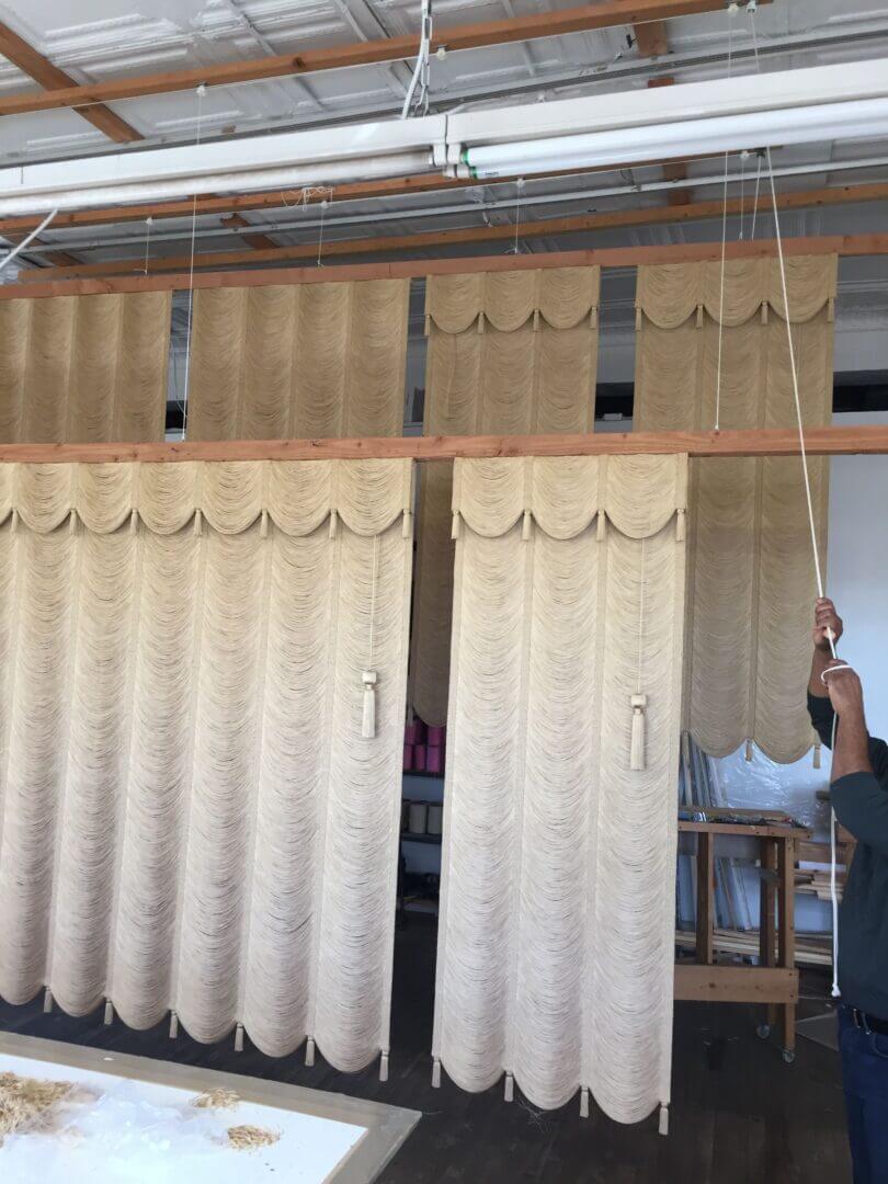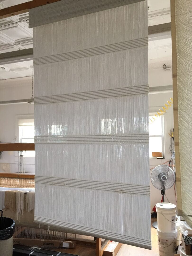 Draperies with free-hanging strings that are loomed with 4-5 strings across (weft/horizontal) at variable distances.