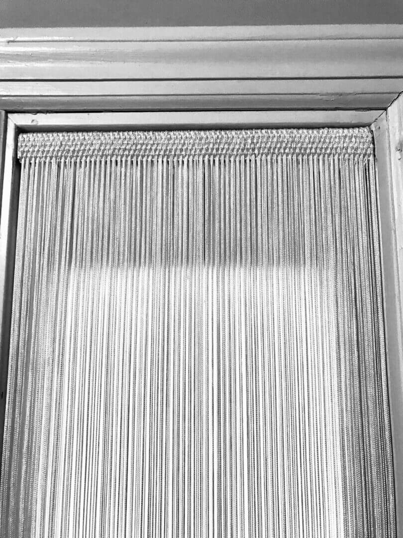 Draperies with free-hanging strings that are loomed with 4-5 strings across (weft/horizontal) at variable distances.