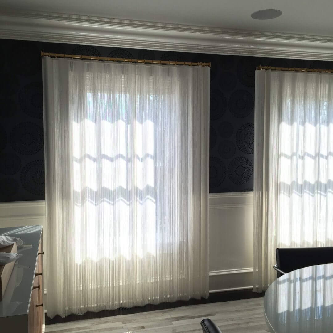 Our String Roman Shades are free falling window coverings with strings that are woven every 2’-3” on the solid weave across (horizontal weft) and are spaced apart approximately every 10”.