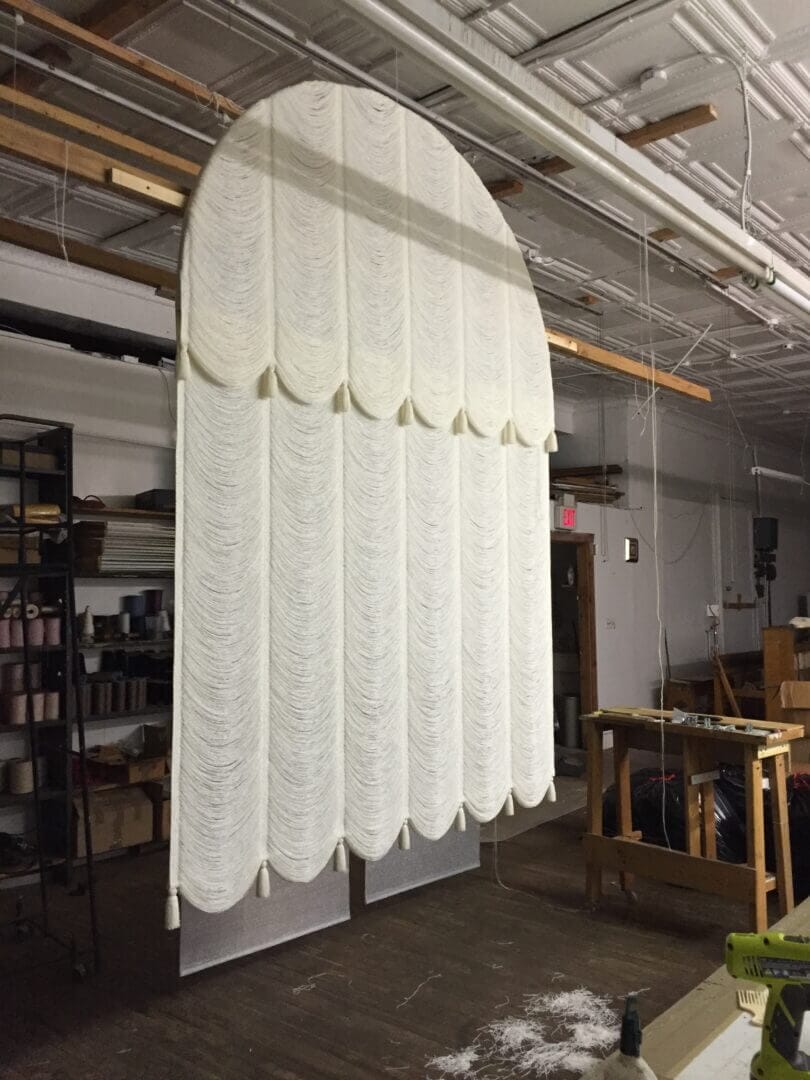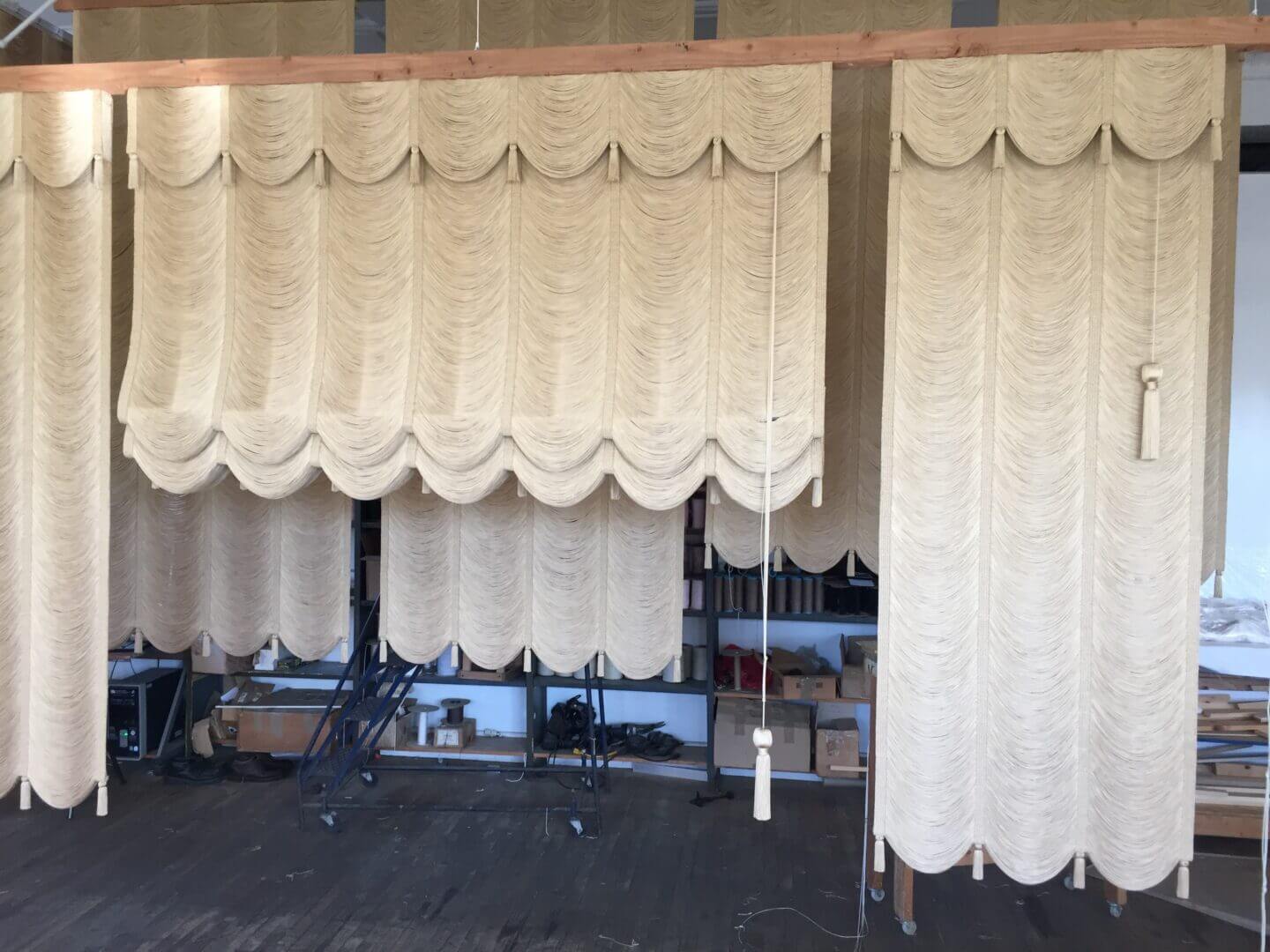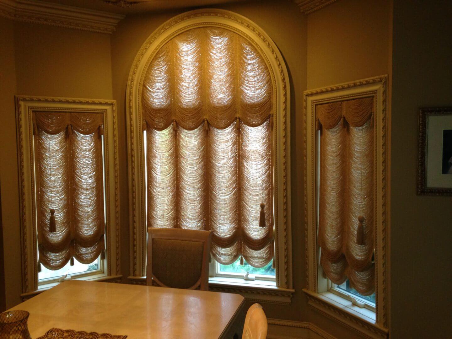 The strings are available in a wide variety of colors, and can be made to any width and height as required. Our Austrian String Shades can be crafted into many shapes: Square, and rectangular, as well as angles and arches of all types and sizes. For an extra touch of elegance, small tassels are applied in-between swags on the valance, and at the bottom of the shade. Transparency and sheerness are achieved by increasing the string count in the warp (vertical).