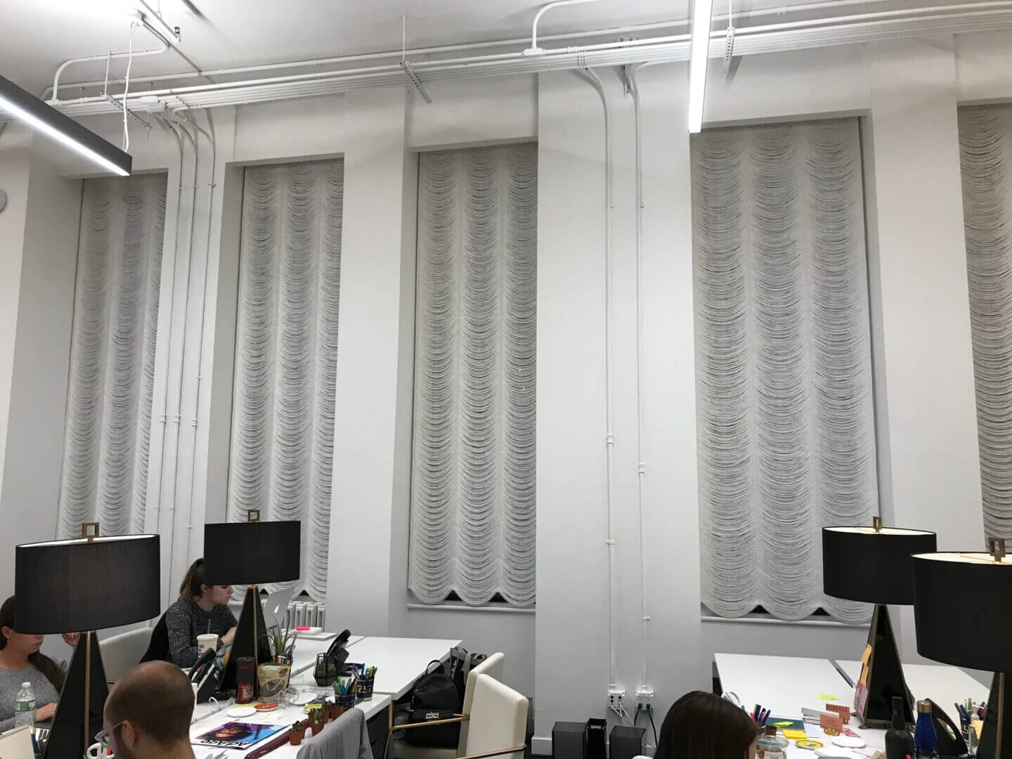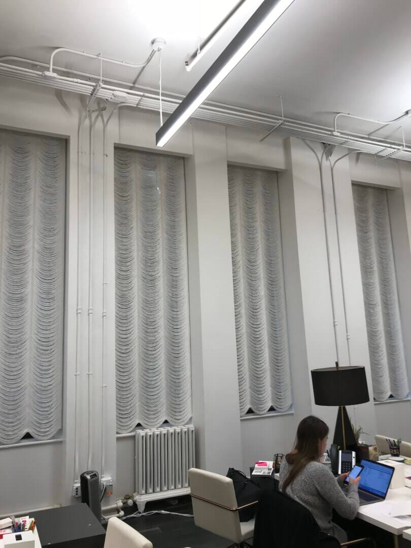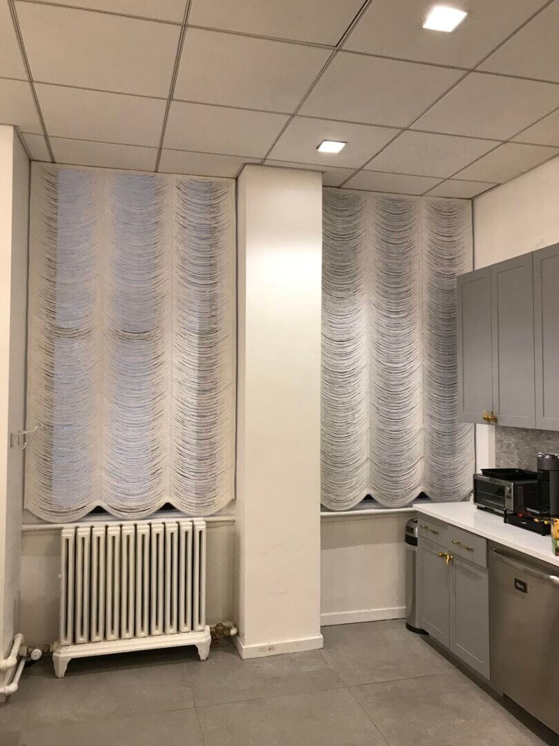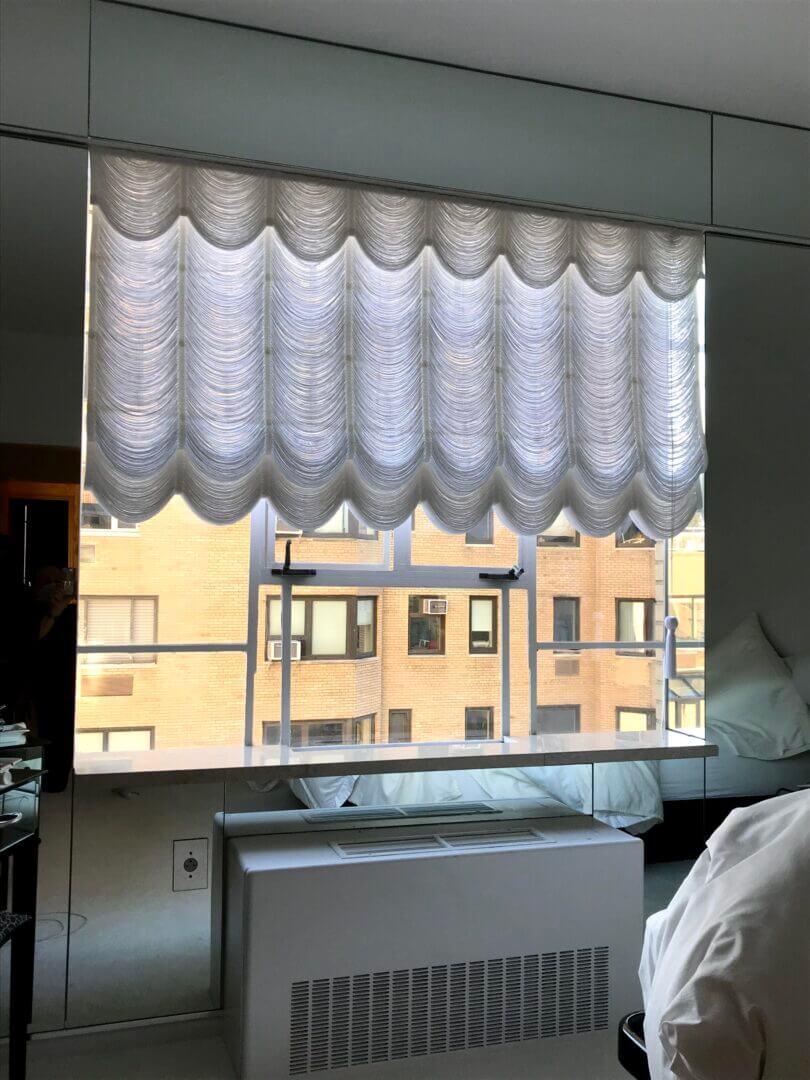 For extra privacy we offer translucent or blackout lining, which is hand sewn to the folds of the shade. When Austrian shades are used for more modern rooms, we can weave them with swags (festoons) either wider or more shallow. Austrian Shades are made with thin acrylic rods on the back, so when folded, the sides do not sag inward. Austrian Shades can be operated either manually, or by motorized mechanism – and can be adapted to any home automation system. Strings are available from our string color selection as a single color or a mix of colors, with additional custom dyed colors. Austrian Shades can be used in both homes and commercial spaces.